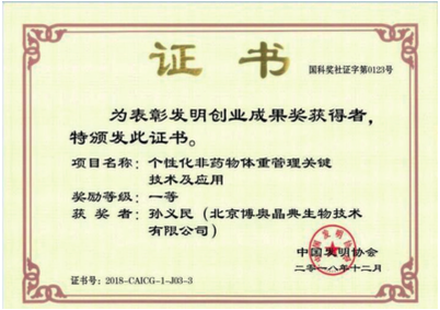 《個(gè)性化非藥物體重管理關(guān)鍵技術(shù)及應(yīng)用》榮獲“2018 年發(fā)明創(chuàng)業(yè)成果獎(jiǎng)”一等獎(jiǎng)