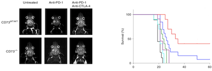 2019年12月,Nature Medicine發(fā)表對免疫檢查點治療效果好和不好的5種癌癥類型,共94例患者進行單細(xì)胞蛋白和單細(xì)胞RNA測序,在多形性膠質(zhì)母細(xì)胞瘤中發(fā)現(xiàn)了一個獨特的CD73hi巨噬細(xì)胞群,在抗PD-1治療后仍然存在。通過構(gòu)建CD73敲除鼠發(fā)現(xiàn)CD73的缺失提高了抗CTLA-4和抗PD-1治療的多形性膠質(zhì)母細(xì)胞瘤小鼠模型的存活率。證實CD73是一種特異性的免疫治療靶點,可提高多形性膠質(zhì)母細(xì)胞瘤免疫檢查點治療的抗腫瘤免疫應(yīng)答。