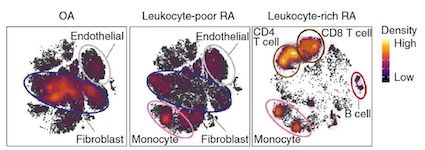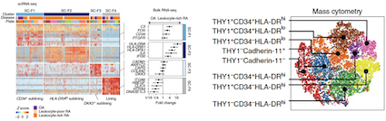 2019年5月,Nature Immunology報道關(guān)于類風(fēng)濕性關(guān)節(jié)炎(RA)的研究。作者對來自RA或骨關(guān)節(jié)炎(OA)患者的51個滑膜組織樣品的T細(xì)胞、B細(xì)胞、單核細(xì)胞和成纖維細(xì)胞進行單細(xì)胞RNA測序(scRNA-seq)、質(zhì)譜流式檢測、 轉(zhuǎn)錄組測序(bulk RNA-seq)和普通流式細(xì)胞檢測。利用基于5,265個scRNA-seq圖譜典型相關(guān)分析的綜合策略,作者鑒定了18個獨特的細(xì)胞群。通過在單細(xì)胞層面對跨數(shù)據(jù)模態(tài)進行整合,精確定義了特定細(xì)胞亞群在RA和慢性炎癥中的作用。