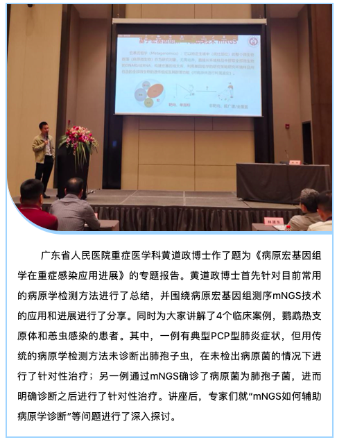 日前,福建省重癥醫(yī)學(xué)培訓(xùn)會(huì)——中國重癥醫(yī)學(xué)多學(xué)科精髓(MCCRC)培訓(xùn)班在福州召開。本次培訓(xùn)班邀請(qǐng)了省內(nèi)外知名專家圍繞重癥醫(yī)學(xué)領(lǐng)域新技術(shù)的發(fā)展等內(nèi)容進(jìn)行了專題報(bào)告,其中,廣東省人民醫(yī)院重癥醫(yī)學(xué)科黃道政博士及博奧晶典產(chǎn)品總監(jiān)劉瑩瑩博士受邀出席,并作了題為“病原宏基因組學(xué)在重癥感染應(yīng)用進(jìn)展”和“病原宏基因組學(xué)報(bào)告解讀”的專題報(bào)告,報(bào)告受到福建省醫(yī)學(xué)會(huì)重癥醫(yī)學(xué)分會(huì)主任委員、福建醫(yī)科大學(xué)附屬第一醫(yī)院ICU主任林建東教授的支持與點(diǎn)評(píng)。