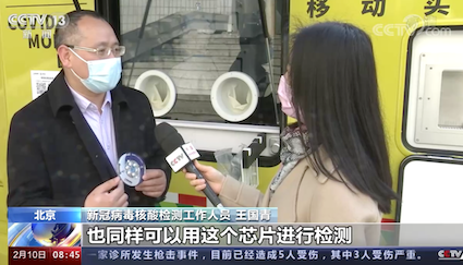? ? ? “這個芯片相當(dāng)于一個微型的實驗室它集成了核酸的提取、核酸的擴增檢測,在芯片里面全自動完成,45分鐘以后,我們就可以在系統(tǒng)里看到結(jié)果?!北本┎W晶典生物技術(shù)有限公司副總裁王國青表示。信息結(jié)果將同步推送到健康寶,除了人的樣本以外,環(huán)境樣本也可以用全集成芯片進行檢測。