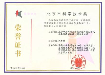 另外,與本產(chǎn)品相關(guān)的“基于孕婦外周血游離DNA的胎兒染色體異常檢測系統(tǒng)的研發(fā)及應(yīng)用”榮獲2018年度北京市科學(xué)技術(shù)獎二等獎。