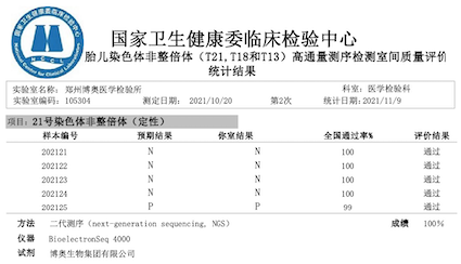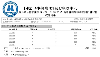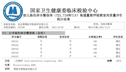 近日,國家衛(wèi)生健康委臨床檢驗中心發(fā)布了《2021年外周血胎兒染色體非整倍體(T21,T18和T13)高通量測序檢測室間質量評價結果》,博奧晶典旗下北京、廣東、成都等11家檢驗實驗室全滿分通過。