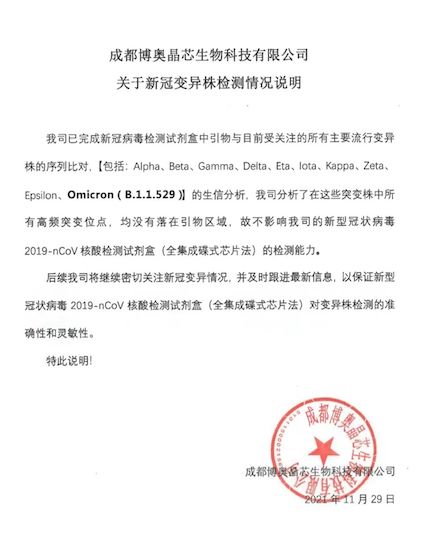 目前,旗下成都博奧晶芯生物科技有限公司已完成新冠病毒檢測試劑盒中引物與目前主要流行變異株的序列比對【包括但不限于:Alpha、Beta、Gamma、Delta、Eta、Iota、Kappa、Zeta、Epsilon、Omicron(B.1.1.529)】,結(jié)果證實:博奧晶典已上市的新型冠狀病毒2019-nCoV核酸檢測試劑盒(全集成碟式芯片法),不會出現(xiàn)脫靶和漏檢的情況。后續(xù),博奧晶典將持續(xù)緊密追蹤全球新冠病毒變異株的最新動態(tài)并及時跟進(jìn)最新信息,確保全集成新冠病毒核酸檢測芯片試劑盒對變異株檢測的準(zhǔn)確性和靈敏性。
