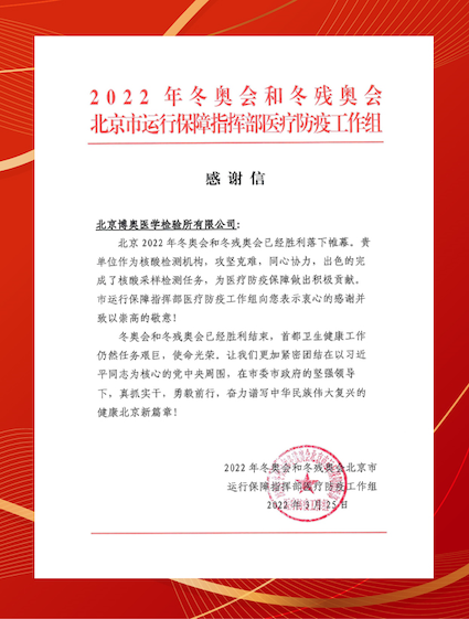 作為戰(zhàn)疫國家隊(duì)成員,在此次北京冬奧會(huì)和冬殘奧會(huì)期間,博奧晶典承擔(dān)了為來自世界各地的國家元首、政府首腦、王室成員和國際組織負(fù)責(zé)人等重要來賓提供實(shí)時(shí)就地核酸檢測以及人員和環(huán)境樣本的核酸檢測任務(wù),以硬核“芯”科技賦能奧運(yùn),收獲了來自冬奧會(huì)和冬殘奧會(huì)北京市運(yùn)行保障指揮部醫(yī)療防疫工作組的感謝、表揚(yáng)和點(diǎn)贊。