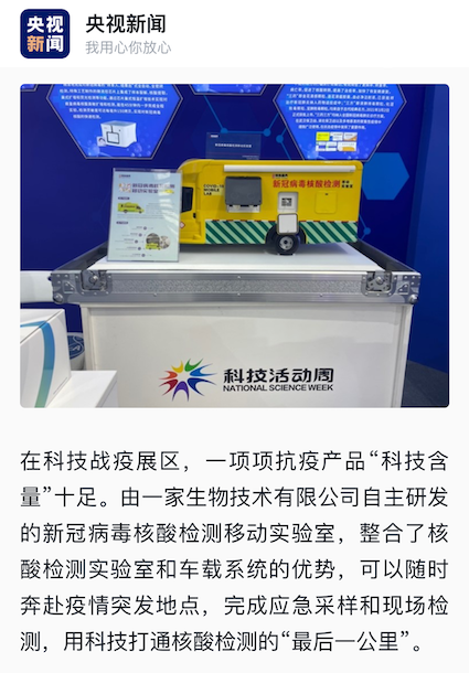 科技周上,全集成芯片實驗室系統(tǒng)、全集成新冠病毒核酸檢測移動實驗室也吸引了諸多媒體打卡留念、競相報道。