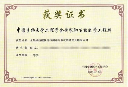 在程京院士帶領(lǐng)和國家重點研發(fā)計劃支持下,“全集成核酸快速檢測芯片系統(tǒng)的研發(fā)及臨床應(yīng)用”項目突破了一系列關(guān)鍵技術(shù)難題,首創(chuàng)了全集成核酸快速檢測芯片系統(tǒng)。成果達到“國內(nèi)首創(chuàng)、國際領(lǐng)先”,儀器和芯片試劑盒于2021年通過國家藥監(jiān)局應(yīng)急審批獲Ⅲ類醫(yī)療器械證書,通過歐盟CE認證。項目成果被評為“2021年中國醫(yī)藥生物技術(shù)十大進展”,并被納入《北京市首臺(套)重大技術(shù)裝備目錄(2021年)》,榮獲CAETS(國際工程院理事會)頒發(fā)的首屆唯一一項“2021 CAETS傳播獎-工程成就獎”。