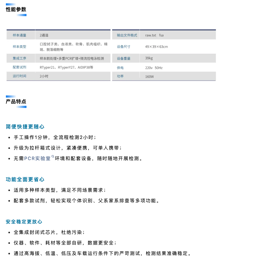 該設(shè)備采用拉桿箱式設(shè)計(jì),可由單人攜帶使用,適用于戶外、車載、高原環(huán)境等,是國際首款“可移動法醫(yī)DNA實(shí)驗(yàn)室”,為全球公共安全部門在現(xiàn)場物證檢驗(yàn),重點(diǎn)人員篩查、重大公共安全事件的快速處置、出入境邊防檢查等應(yīng)用場景增添強(qiáng)勁利器。