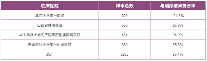 1925 例來自北京大學(xué)第一醫(yī)院、山西省腫瘤醫(yī)院等醫(yī)療機(jī)構(gòu)的臨床樣本使用 HPV 檢測試劑盒檢測結(jié)果表明:對(duì)于 HPV 感染陽性的樣本,芯片檢測結(jié)果與 DNA 測序結(jié)果比較,符合率在 95% 以上。
