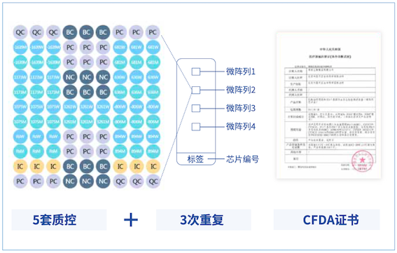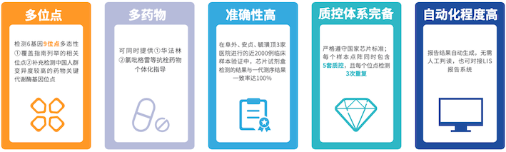 抗栓治療用藥相關6個基因位點多態(tài)性檢測試劑盒(微陣列芯片法)采用多重等位基因序列特異性PCR結合通用微陣列芯片(Allele-Specific PCR-based Universal Array,ASPUA)方法,對人基因組DNA中VKORC1、CYP2C9、CYP4F2、GGCX、CYP2C19和CYP3A4這6個基因的9個多態(tài)性位點進行檢測。